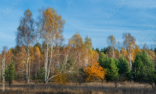 Forest decorated with autumn colors. Good weather. Blue sky. Walking outdoors.