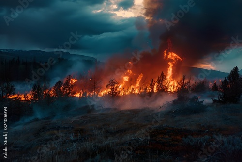 Forest fire with smoke at dusk. Climate change and global warming. Natural disaster and wildfire concept. Design for banner, poster