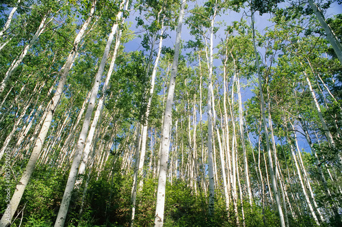horizontal, alberta, outdoors, day, plant, beautiful, sunny, bright, canada, vegetation, growth, deciduous, height, flora, scenic, treetop, tree trunk, tourist destination, nature, white, blue skies, blue, canadian, green, scenic, sky, forest, attraction, natural, destination, travel, foliage, landscape, color image, tourist attraction, travel destination, no people, populus