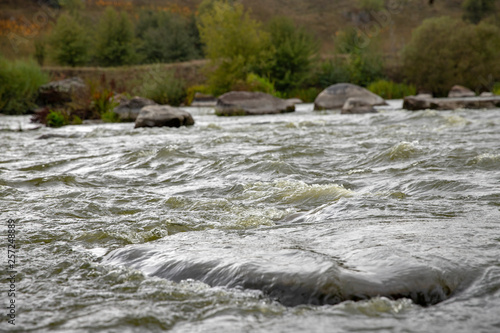 Forest river waterfall view. Wild river rapids. Forest wild river water flow. River stream water view