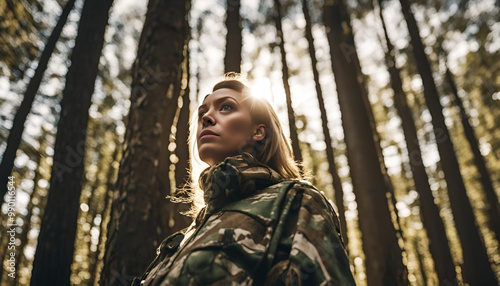 Forest Solitude: Reflective Young Woman in Camouflage Jacket Amongst Tall Pines, Hunting Landscapes, Female Hunter, Wilderness Adventures, Hunting Scenes, Forest Landscape