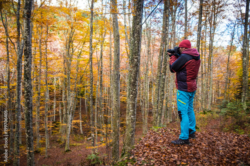 Foreste Casentinesi National Park, Badia Prataglia, Tuscany, Italy, Europe. One person taking pictures in the wood.
