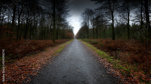 Forested Pathway With Autumnal Leaves And Dark Trees Under Overcast Sky