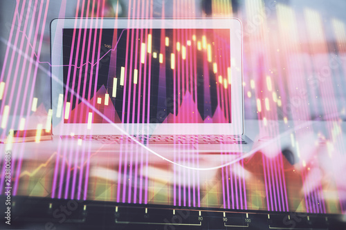Forex market graph hologram and personal computer on background. Multi exposure. Concept of investment.