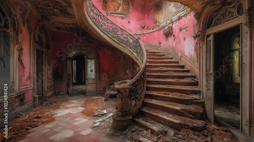 Forgotten Elegance, a crumbling mansion reveals echoes of its former splendor, broken staircase, faded opulence, a haunting reminder of the past
