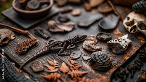Fossil collection on display, historical and intriguing, Vintage, Earth tones, Photograph, Paleontological detail