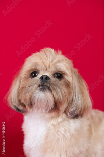 dog, animal, pet, puppy, shih tzu, canino, domestic, breed, pretty, studio, mammal, purebred, adorable, skin, christmas, small, sitting, brown, terrier, looking, tongue, hair, doggy, friends, closeup, face, thoughtfulness, nobody, holiday