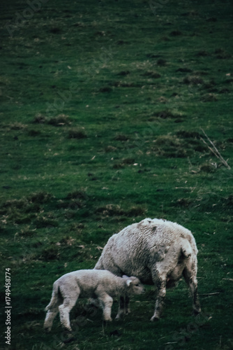 Fotografía de una oveja junto a un cordero en un valle de Matamata, Nueva Zelanda.