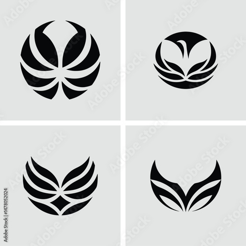 Four abstract vector logo designs for branding icons in black and white on light gray