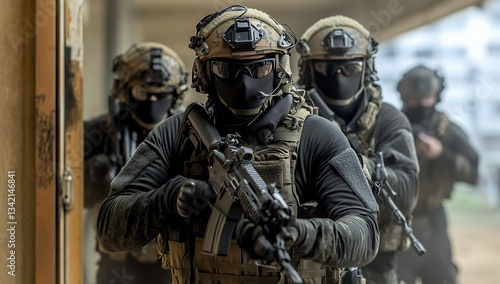 soldier, military, rifle, operation, mission, team, action, combat, security, army, police, special forces, doorway, building, dust, gritty, intense, man, weapon, camouflage, helmet, serious, focused, dangerous, war, conflict, law enforcement, prepared, ready, strategy, defense, protection, urban, grey, brown, black, dark, closeup, inside, movement