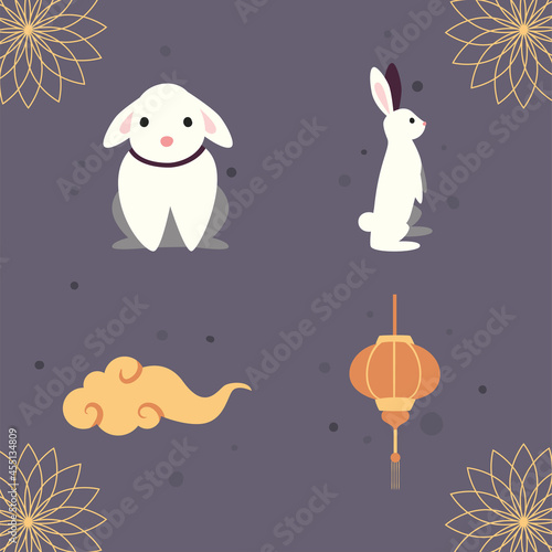 autumn, festival, celebration, chinese, oriental, asian, august, culture, lovely, cultural, ethnic, tradition, mandala, rabbit, lamp, lantern, cloud, traditional, east, rabbit, eastern, vector, illustration, design, 4, number, set