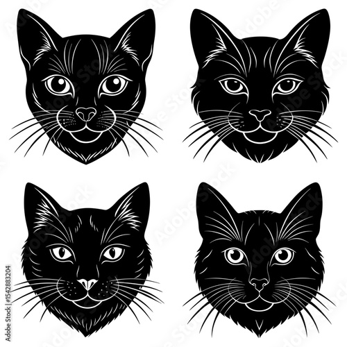 Four black cat faces with detailed whiskers and expressive eyes in a symmetrical arrangement design