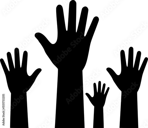 hand, raised, upwards, reaching, silhouette, democracy, human, diversity, crowd, vector, gesture, arm, request, vote, support, help, together, community, agreements, participation, people, volunteer, black, white, open, finger, body, teamwork, oneness, acceptance, hope, demand, choice, asking, reaching out, group, involvement, signs, illustration