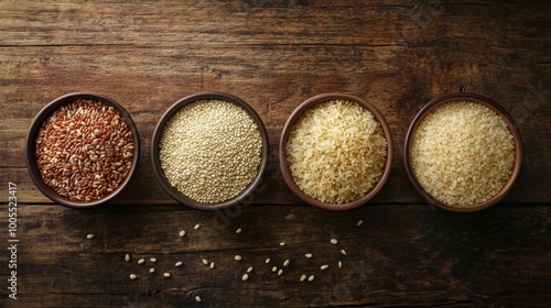 Four bowls of different grains arranged on a wooden surface, showcasing a variety of textures and colors, ideal for culinary uses.