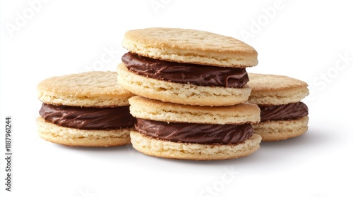 Four chocolate cream filled sandwich cookies, stacked, isolated on white background.