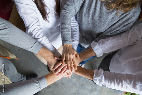 person, people, female, woman, young, adult, man, male, concept, casual attire, top, view, closeup, stack, pile, hand, putting, 4, team, group, member, employee, co-worker, showing, gesticulate, motivation, teamwork, together, business, startup, oneness, cooperation, friendship, partnership, support, community, trust, success, strength, bonding, help, collaboration, join, integrity, fellowship, leadership, company, power, meeting, communication