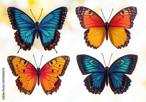 Four colorful butterflies with intricate wing patterns in vibrant shades of blue, orange, red, and yellow displayed against a light blurred background