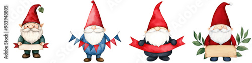 Four colorful gnomes with distinct poses and expressions, white isolated background.