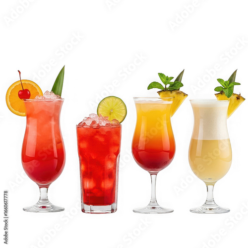 Four colorful tropical cocktails in hurricane glasses, garnished with fruit and mint, isolated on transparent background