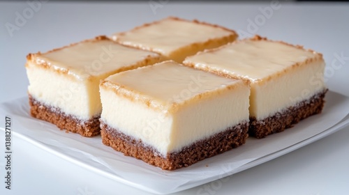 Four creamy cheesecake squares sit on a white plate. Each has a smooth, glossy topping and a crisp brown crust. The photo is well-lit, high-resolution, and features a shallow depth of field. The sty