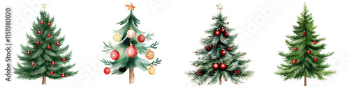 Four decorative Christmas trees with ornaments, isolated on white background.
