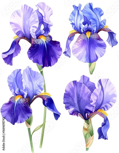 Four detailed illustrations of vibrant purple and lavender irises