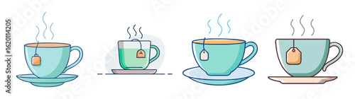 tea, cup, teacup, hot, beverage, drink, illustration, cartoon, style, minimal, simplicity, cute, cosy, relaxing, breakfast, refreshment, mug, teabag, steam, liquid, saucer, tableware, caffeine, green, teal, brown, label, morning, aromatic, hot drink, herbal tea, wellness, afternoon tea, enjoyment