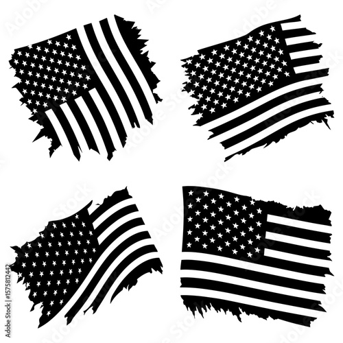 Four distressed american flags in black and white with star and stripe patterns in a grunge style design