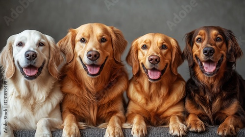 Four dogs of different colors are standing next to each other, all with their mouths open and tongues hanging out. The dogs are all smiling and seem to be enjoying each other's company