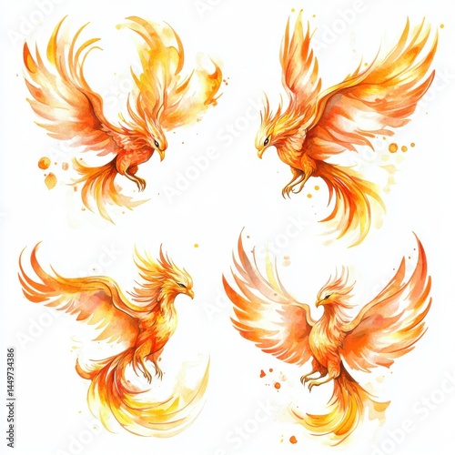 phoenix, bird, mythical, creature, watercolor, painting, orange, yellow, fire, wing, flight, fantasy, art, illustration, design, graphic, symbol, legend, mythology, spiritual, powerful, elegant, graceful, fiery, bright, colourful, vibrant, artistic, creative, imaginative, whimsical, abstract, surreal, beautiful, amazing, stunning, mesmerizing, captivating, enchanting, magical, mysterious, divine, holy