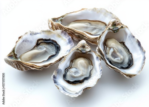 Four fresh raw oysters displayed with shells opened revealing glossy flesh inside on a white background