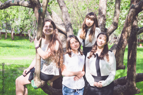 Four girl friends hugging and smiling near the tree