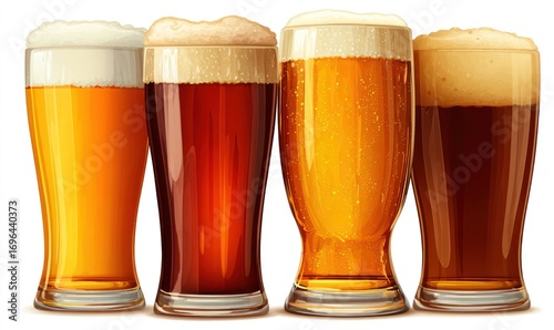 Four glasses of different beers with creamy foam, light to dark, sitting together on a white background