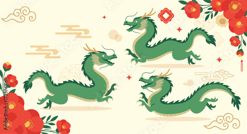 dragon, chinese new year, celebration, festive, traditional, holiday, art, illustration, digital artwork, graphic design, pattern, background, animal, mythology, fantasy, culture, asia, oriental, red flower, green, cartoon, playful, joyful, energy, movement, dynamic, cute, whimsical, stylised, vintage, retro, aesthetic, design element, decoration, ornament, seasonal, event, symbol, prosperity, fortune, good luck