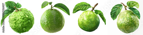 Four green guava fruits with leaves on white background. Perfect for food and beverage designs, cooking ingredients, or natural product images.