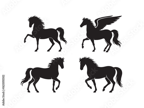 horse, equine, animal, silhouette, running, galloping, motion, power, freedom, wild, nature, wildlife, black, white, background, vector, illustration, graphic, design, art, isolated, mammal, farm animal, fast horse, mare, foal, herd, mane, tail