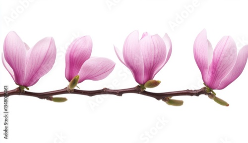 Four light pink magnolia blossoms in full bloom on a dark brown branch, isolated on a white background. Soft lighting creates a delicate and serene mood.