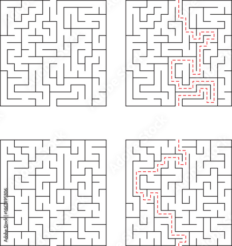 Four maze puzzles showcasing complexity and solutions for problem solving and navigation