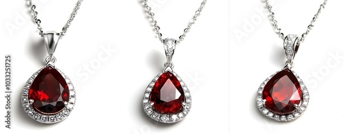 Four pendants with red stones in different shapes on a white background, with white gold chains and silver jewelry.
