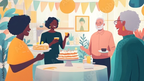 people, party, celebration, cake, birthday, dessert, food, drink, gathering, friends, family, happy, joy, festive, cheerful, smiling, table, decoration, balloon, banner, flower, indoor, home, living room, diverse, generation, adult, senior, woman, man, black, white, group, together, event, happiness, special, occasion, casual attire, social, enjoyment, hospitality, entertainment, lifestyle, relax