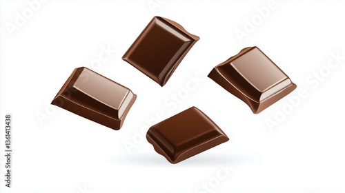 Four pieces of dark chocolate are depicted against a pure white background. The chocolate squares appear to be in mid-air, creating a sense of levitation and movement. The image is sharply focused