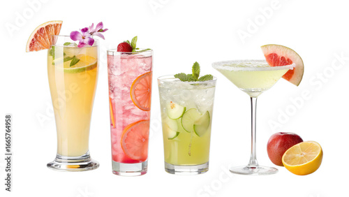 Four refreshing cocktails with fruit garnishes isolated on transparent background