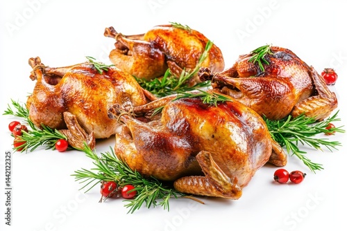 Four roasted chickens garnished with rosemary and cranberries on a white surface for a festive meal