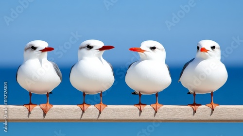Four Seagulls on a Rail: Four white seagulls with red beaks and legs are perched side by side on a light-colored railing against a vibrant blue ocean backdrop.