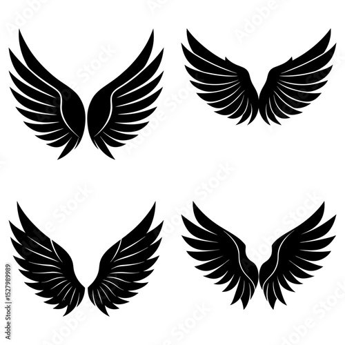 Four sets of black feathered wings displayed in a square arrangement on a white background design art