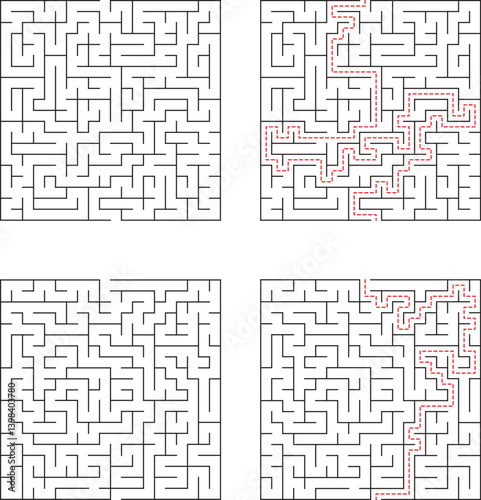 Four Square Mazes With Solutions In Red Dotted Lines Challenge Game