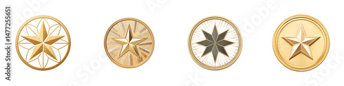 Four stylish golden badges featuring intricate star designs, showcasing vibrant metallic textures and a sophisticated elegance, perfect for awards, achievements, and decorative purposes.
