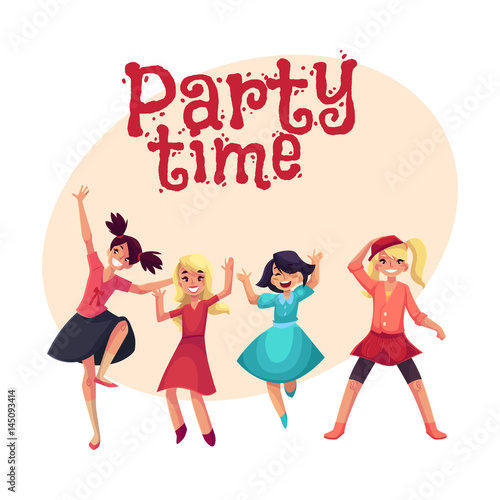 Four various girls in colorful clothes having fun, dancing at party, ,cartoon style invitation, banner, poster, greeting card design. Party invitation, advertisement, happy girls, having fun, dancing