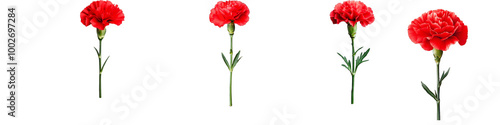 Four vibrant red carnations in various stages of bloom with green stems on a transparent background showcasing natural beauty and floral elegance