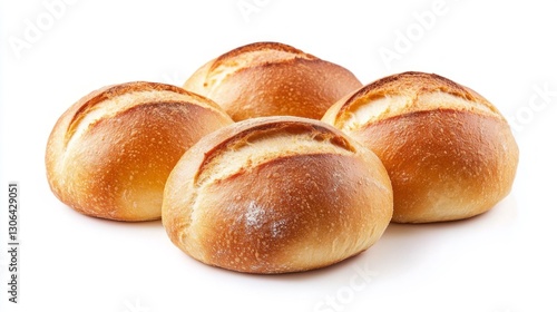 Four warm and crispy bread rolls rest beautifully on a clean white surface, showcasing their golden-brown crust and soft texture. Ideal for serving at gatherings or enjoying fresh from the oven